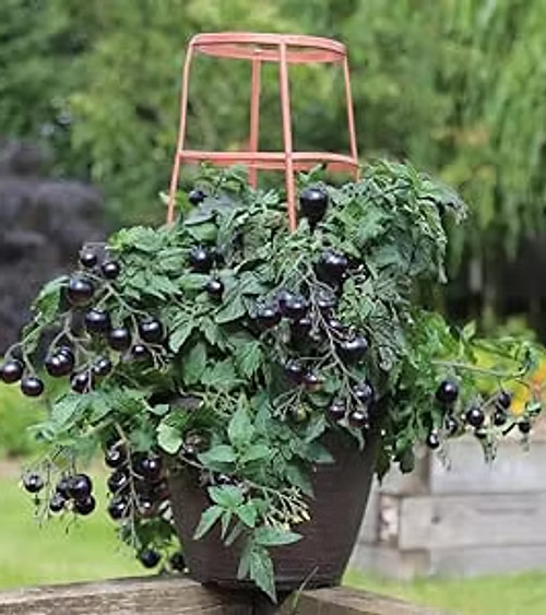 An eye-catching basket or patio container variety, that is sure to create a talking point, these compact plants with attractive purple-dark green foliage produce unusual cocktail-sized fruits ripening gradually from green to black, changing to orange-red when they will be fully ripe and at their best to eat.
